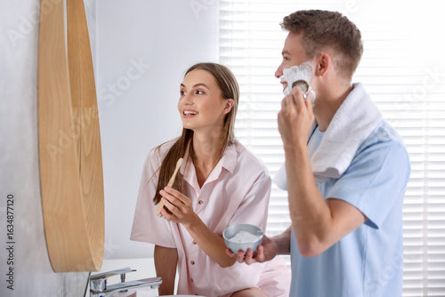 © New Africa, Fototapeta premium Young couple getting ready together near mirror at home
