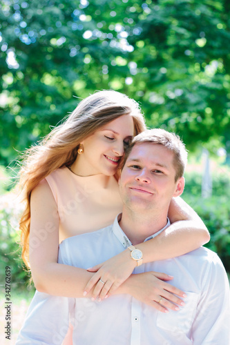 Fototapeta premium Young couple - girl huggs guy from back and smiling