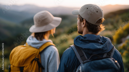 © Kateryna, Fototapeta premium Young couple hiking in mountains embracing nature and adventure