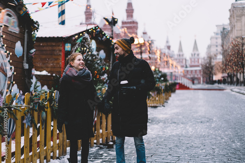 © GalakticDreamer, Obraz premium Young couple holding hands and walking on Red Square