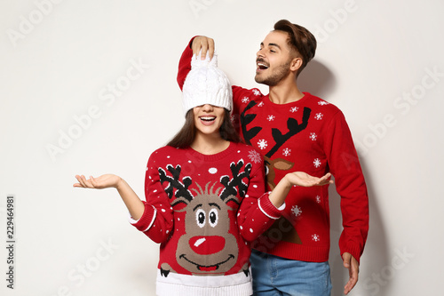© New Africa, Obraz premium Young couple in Christmas sweaters on white background