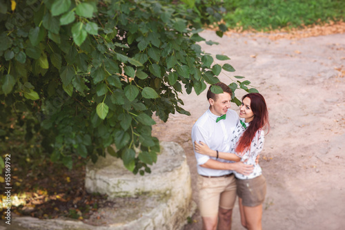 © Wedding photography, Fototapeta premium Young couple in love embracing in park, happy people outdoors