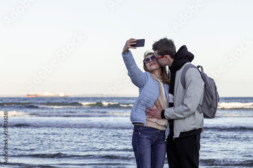 Obraz premium Young couple in love on sea shore taking selfie with mobile phone. Portrait of a romantic couple in love hugging and kissing by the sea. Tourists taking travel photos on their holidays in cold season.
