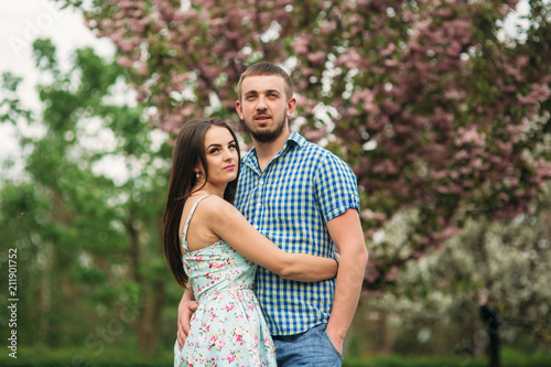 © Aleksandr, Fototapeta premium Young couple in love resting in the blooming garden. white blooming trees