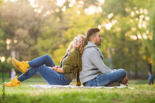 © bokan, Fototapeta premium Young couple in park posing in front of a camera