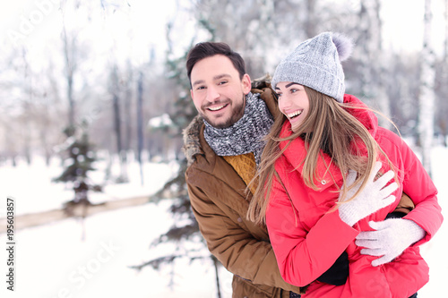 © Africa Studio, Fototapeta premium Young couple in snowy park on winter vacation