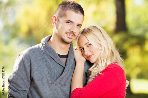 © bokan, Fototapeta premium Young couple kissing in a park on beautiful autumn day