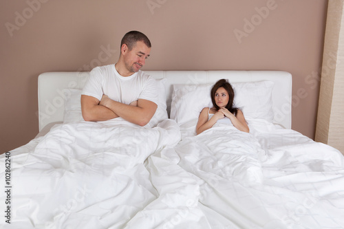 © Czanner, Fototapeta premium Young couple lying in bed and woman is very small