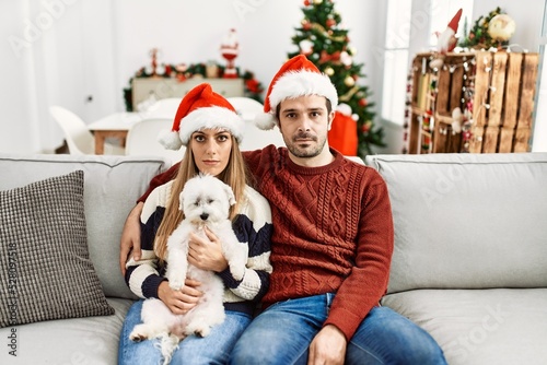 © Krakenimages.com, Obraz premium Young couple of wife and husband sitting on the sofa wearing christmas hat at home thinking attitude and sober expression looking self confident