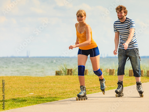 Obraz premium Young couple on roller skates riding outdoors