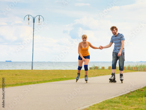 Obraz premium Young couple on roller skates riding outdoors