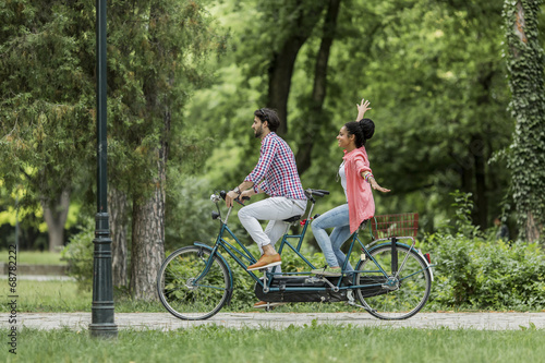 Obraz premium Young couple riding on the tandem bicycle