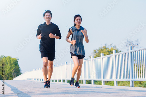 Obraz premium young couple runner running on running road in city park