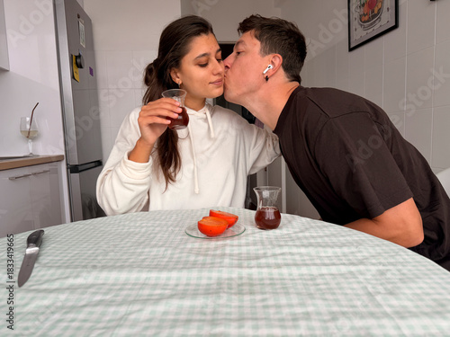 © teksomolika, Naklejka premium Young couple sharing breakfast kiss in apartment kitchen