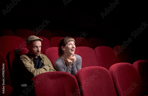 © ra2 studio, Naklejka premium Young couple sitting at red movie theatre