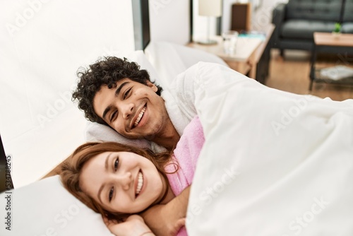 Fototapeta premium Young couple smiling happy and hugging lying on the bed at bedroom.