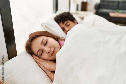 Fototapeta premium Young couple smiling happy sleeping on the bed at bedroom.