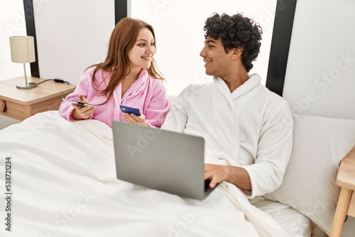 Fototapeta premium Young couple smiling happy using laptop, smartphone and credit card at bedroom.