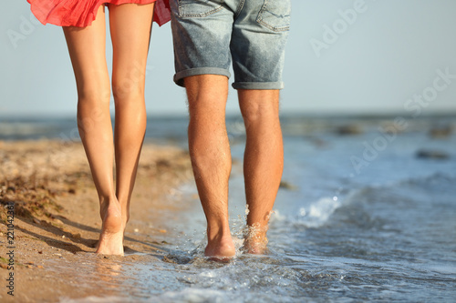Obraz premium Young couple spending time together on beach, closeup of legs