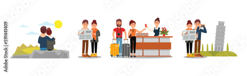 Obraz premium Young Couple Travelling on Vacation Vector Illustration Set