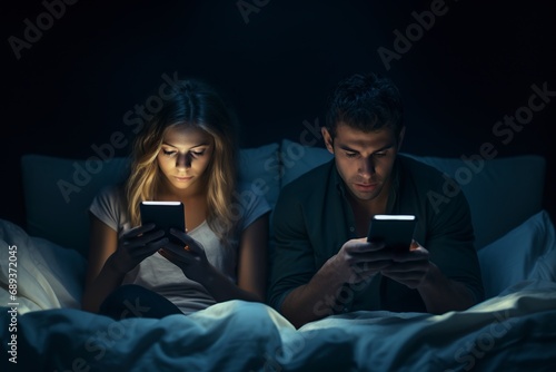 © Jorge Ferreiro, Naklejka premium young couple using their cell phone in bed