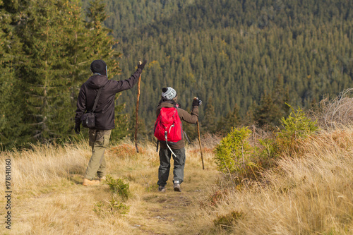 Fototapeta premium Young couple walking on the mountains road in autumn time