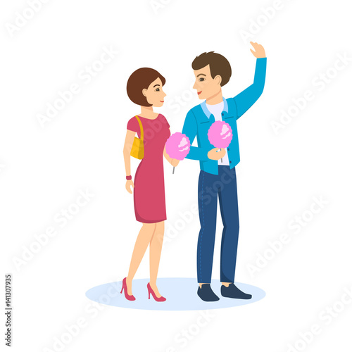 © Idey, Obraz premium Young couple walks the streets of city, eats sweet wadding.