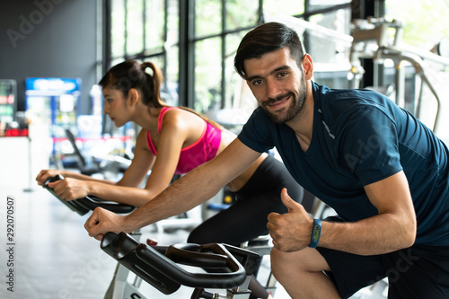 © Wosunan, Obraz premium Young couples work out at the gym to strengthen the body. Each person recommends exercise for each other and encourage each other while exercising.