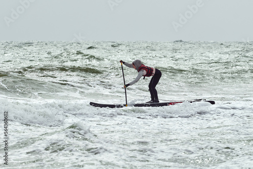 Naklejka premium Young courageous athlete woman surfing by wave on stand up paddle board and catching waves at winter period in sea. Splashes of water. Sea waves, landscape, water sports