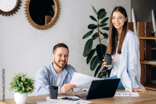 © Kateryna, Fototapeta premium Young creative office workers at the workplace drink coffee and smiling