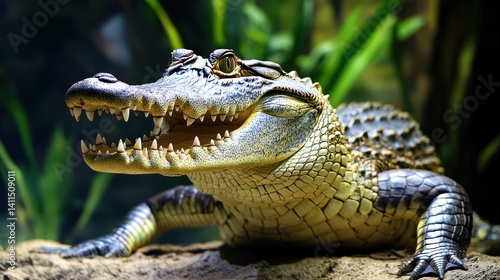 Fototapeta premium Young crocodile open mouth, zoo enclosure, vegetation background. Possible...