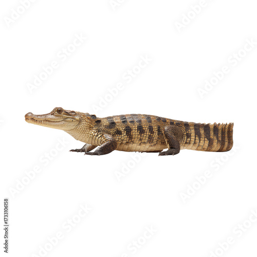 Naklejka premium Young Crocodile Resting on White Background with Detailed Scales and Distinctive Pattern Highlighted