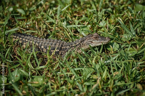 © Kultivad, Naklejka premium Young crocodilians camouflaged in grassy habitat, close-up of a baby reptile in natural surroundings