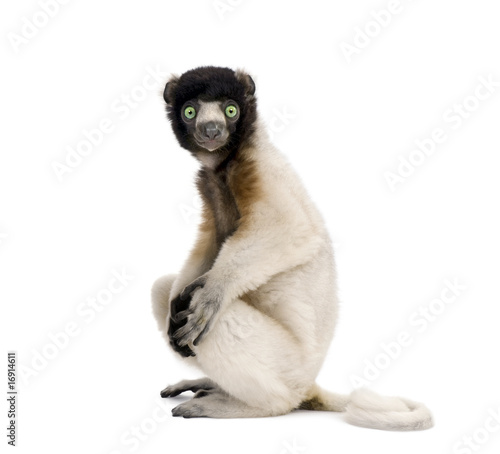 © Eric Isselée, Obraz premium Young Crowned Sifaka sitting against white background