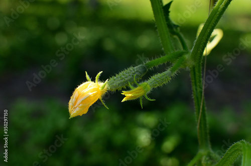 © александр Гуменюк, Naklejka premium Young cucumber with a flower. Agriculture. Green Vegetable Closeup