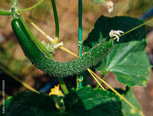 © Cherkasova Alie, Naklejka premium Young cucumbers on a branch in the garden. Growing greenhouse cucumbers.