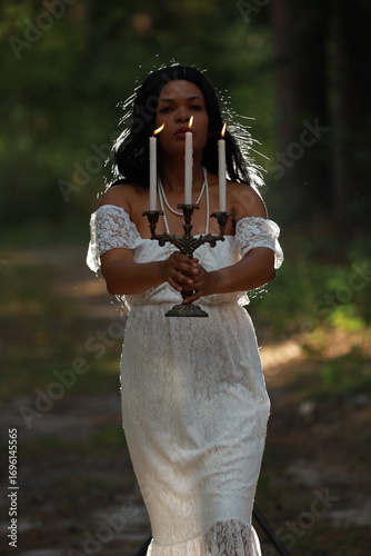 Naklejka premium Young curly dark-haired woman in white dress with vintage candlestick in evening forest