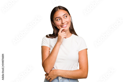 Fototapeta premium Young cute caucasian woman isolated relaxed thinking about something looking at a copy space.
