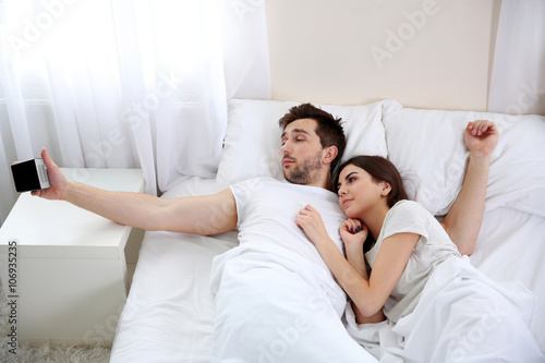 Fototapeta premium Young cute couple waking up after a night sleep.
