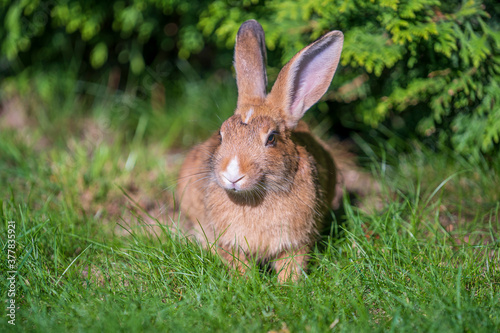 © OlegD, Fototapeta premium Young cute rabbit on green grass eating, close up. Animals and nature concept
