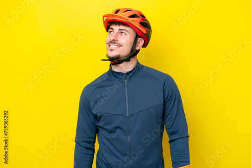 Fototapeta premium Young cyclist caucasian man isolated on yellow background thinking an idea...