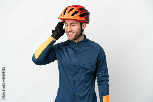 Fototapeta premium Young cyclist man isolated on white background smiling a lot