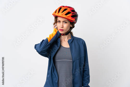 © luismolinero, Fototapeta premium Young cyclist woman isolated on white background having doubts