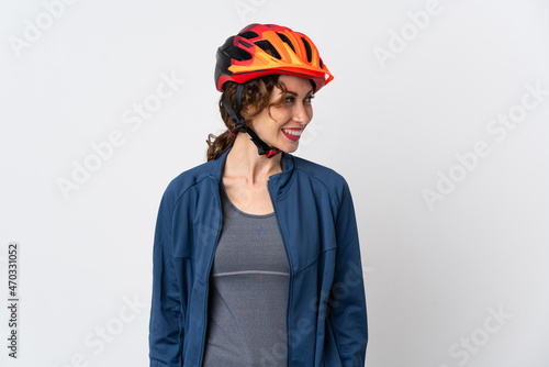 Fototapeta premium Young cyclist woman isolated on white background looking to the side and smiling