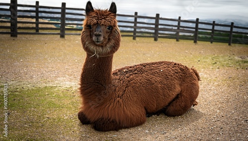 © Miguel, Obraz premium young dark brown alpaca in a kneeling position lama pacos