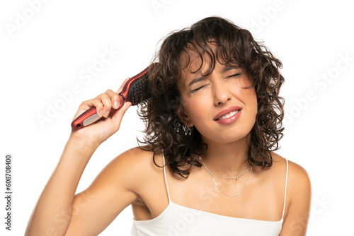 Fototapeta premium Young dark skinned woman with makeup has a problem with combing her wavy hair on a white background