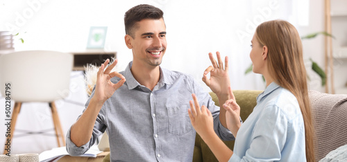 © Pixel-Shot, Obraz premium Young deaf mute couple using sign language at home