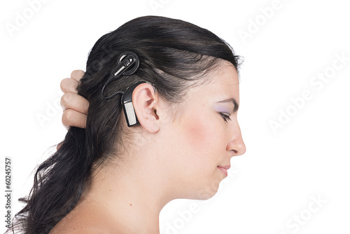 Naklejka premium young deaf or hearing impaired woman with cochlear implant