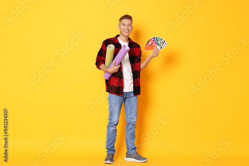 Fototapeta premium Young decorator with color palettes and rolls of wallpaper on orange background