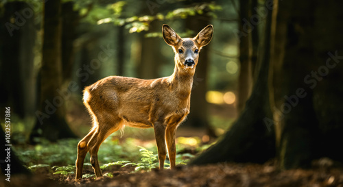 Fototapeta premium Young deer in serene forest setting ideal for nature and wildlife themes